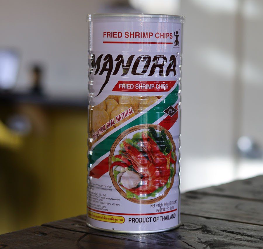 Manora Fried Shrimp Chips are spicy, salty, and light. Thais usually pair this with a side of Nam Prik Pao or chili paste, and a bottle of beer.